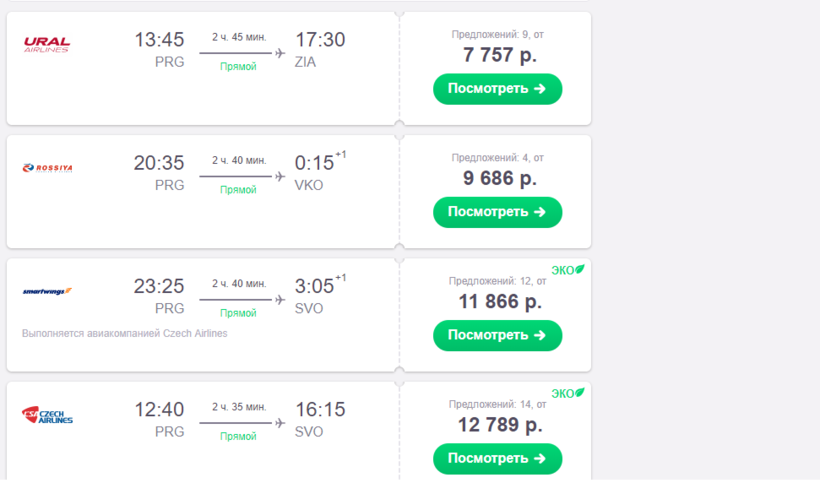 Самые дешевые билеты авиакомпании Ural Airlines. Например, есть рейс из Праги в 13:45, посадка в аэропорту "Жуковский" в 17:30. Ниже фрагмент расписания, там масса рейсов.
