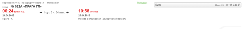 Отправляется поезд от железнодорожной станции Praha hlavní nádraží, а прибывает через сутки с небольшим на Белорусский вокзал Москвы. Поезд, конечно, очень комфортабельный, но и цена на него кусается.