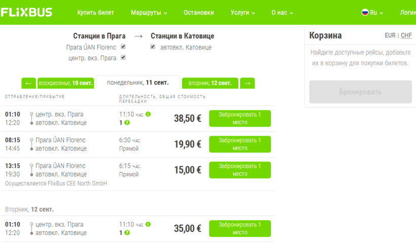 В день компания Flixbus совершает от одного до трех прямых рейсов до Катовице, они бывают утром, в обед и вечером (08:15, 13:15 и 22:50). А Polskibus ездит четыре раза в сутки: 00:30, 09:40, 14:50 и 21:25.