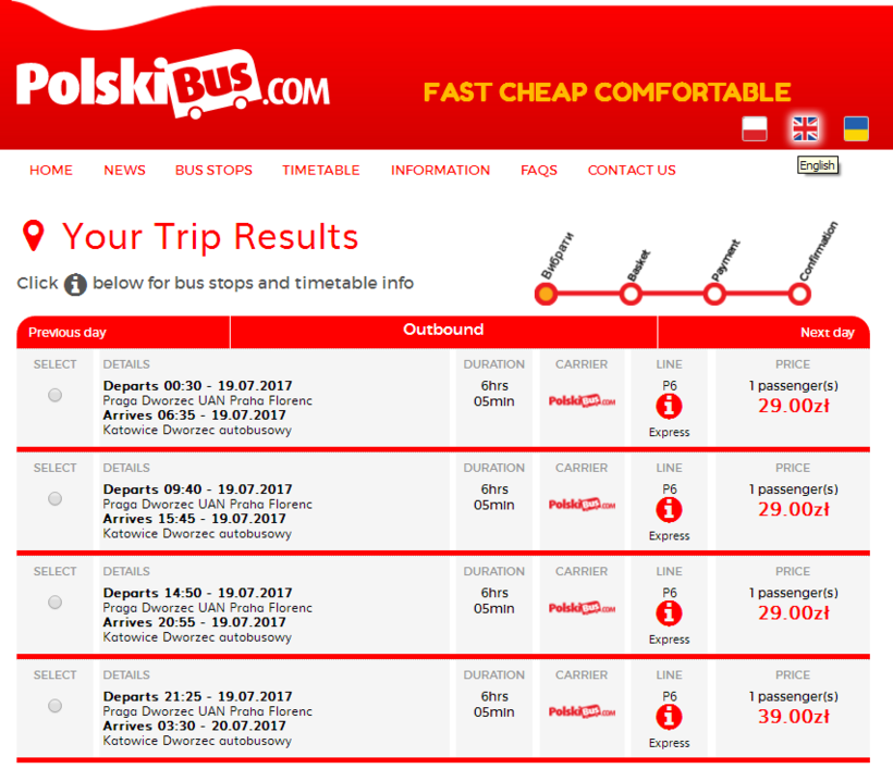 Все эти автобусы отправляются от автовокзала Флоренц в Праге, который находится на улице Pod výtopnou 13/10. Через 6-6,5 часов пути они прибывают на автостанцию Катовице (ul. Piotra Skargi, 1). В салонах есть кондиционеры, интернет, розетки и удобные мягкие кресла.