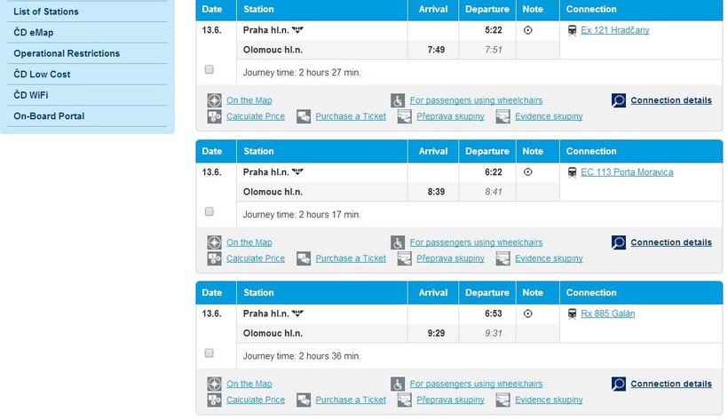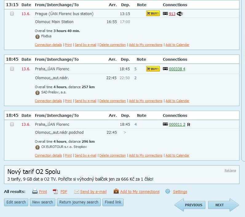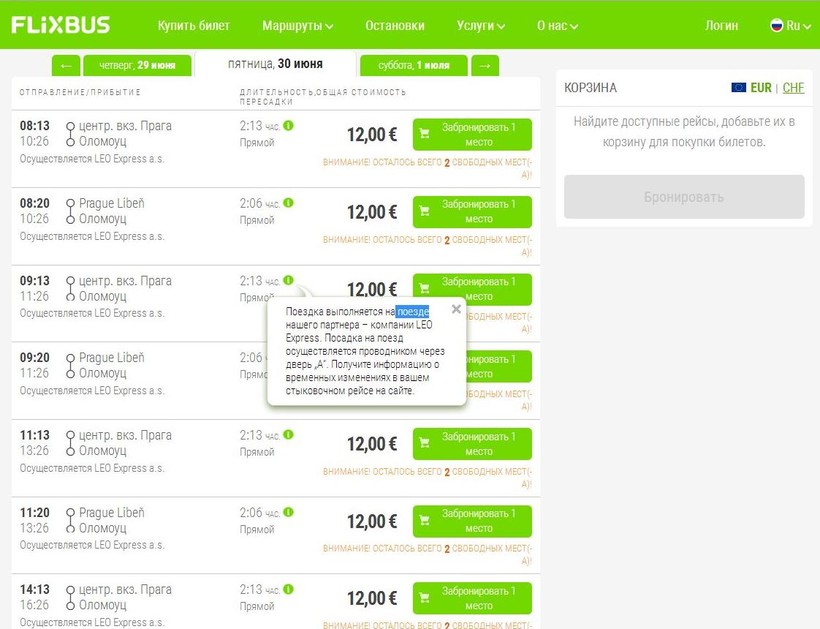 Как видно из скриншота, расписание-то есть, но выполняют эти рейсы поезда Leo Express. Дело в том, что эти два перевозчика сотрудничают, поэтому и рейсы дублируются. А кроме автобусов у Leo Express есть еще и поезда, вот так бывает в Чехии, железнодорожных перевозчиков в этой стране несколько. Хорошо, что я додумалась нажать на значек информации посередине, иначе бы ждала автобуса, а он бы не приехал, ясное дело!