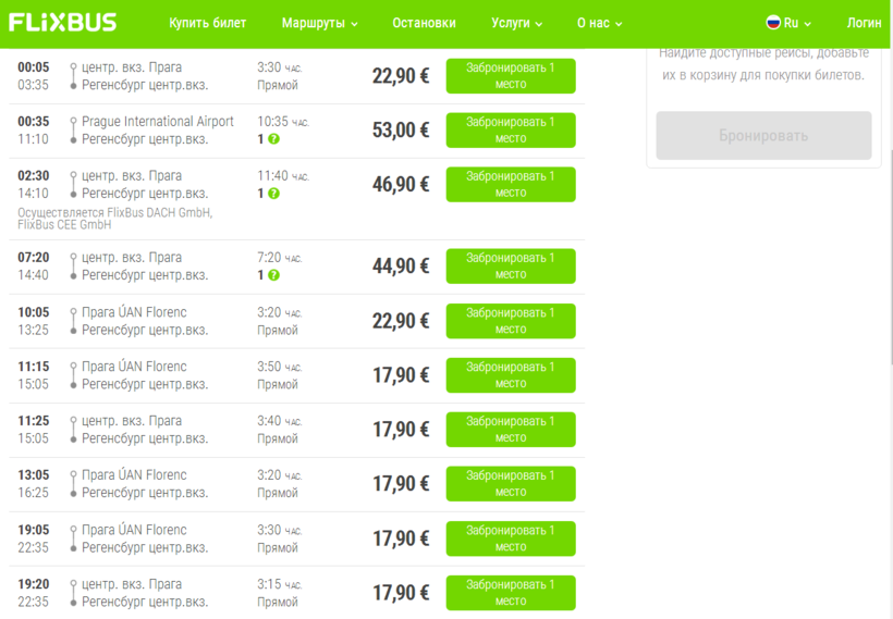 Я обнаружил три прямых рейса в день: в 05:12, 09:12 и 17:12. Все они выезжают с Главного ЖД вокзала столицы Чехии и через 3,5-4,5 часа прибывают на Центральный вокзал Регенсбурга.