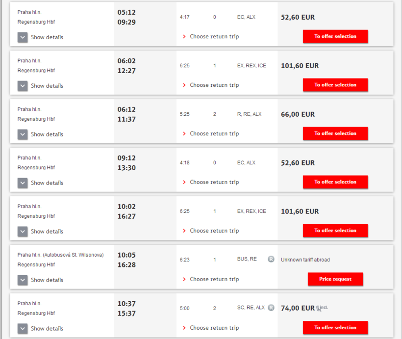 Если честно, я с первого раза не увидел прямых поездов до Регенсбурга. Вернее, я видел, что в графе «Пересадки» значился ноль. Но там, где указывается название поезда, через запятую их стояло целых два: «EX, ALX», что и сбило меня с толку. А объяснение этому довольно простое: поезд выезжает из Праги с названием EX, едет до города Фурт-им-Вальд, где название меняется на ALX! Никаких пересадок не нужно делать!
