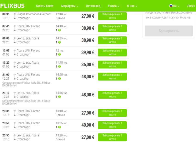 Этот перевозчик ездит напрямую до Страсбурга всего два раза в неделю: по средам и субботам в 23:00. Но, на мой взгляд, этот вариант – очень хороший, так как в автобусе можно поспать и в 8 утра выйти в Страсбурге. При этом экономится время и сумма денег, которую пришлось бы заплатить за ночь в отеле. Выезжают автобусы с автовокзала Florenc в Праге (Pod výtopnou 13/10), а прибывают – на Центральный автовокзал Страсбурга по адресу: 1, Place de l'Etoile. Из плюсов этого варианта хочу отметить высокий уровень комфорта в салонах: тут есть интернет, розетки, планшеты перед каждым пассажиром, чай/кофе/вода, закуски, газеты – и все это бесплатно.