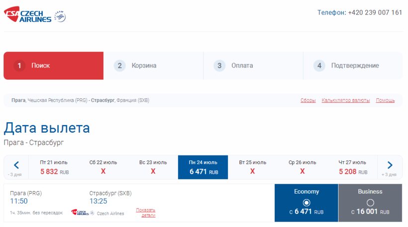 Две авиакомпании совершают прямые рейсы из аэропорта Рузине в Праге до аэропорта Страсбурга: CSA Czech Airlines и Smart Wings. У Чешских авиалиний гораздо более привлекательные цены на перелеты, поэтому расскажу об этой авиакомпании. Рейсы есть три раза в неделю: в понедельник и пятницу – в 11:50, а в четверг – в 16:55. Лететь не долго, всего полтора часа.