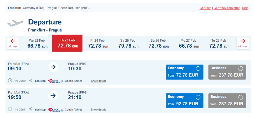 Ниже приведена информация о том, сколько часов вам потребуется, чтобы добраться от Франкфурта-на-Майне до Праги, а также приведена примерная стоимость проезда (средняя цена билета) на том или ином виде транспорта.