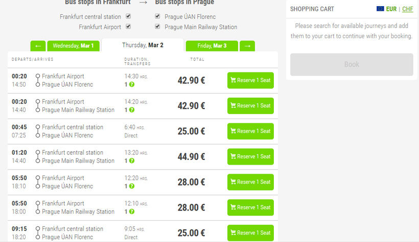 Flixbus предлагает нам ряд прямых рейсов или с пересадками (так получается на три часа дольше).