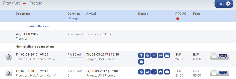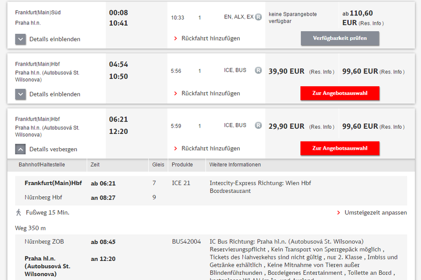 Из Франкфурта в Прагу прямых поездов нет. Как предлагает нам сайт немецкой компании Deutsche Bahn, ехать можно поездом категории ICE в Нюрнберг, а оттуда уже автобусом в Прагу.