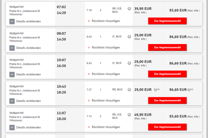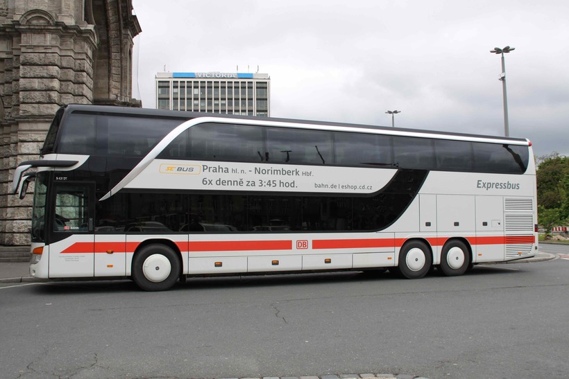 Прямых поездов в Прагу мне найти не удалось, все рейсы, которые я видел, предполагают пересадки. От Центрального вокзала Штутгарта можно добраться на поезде до Нюрнберга, а там прямо на ЖД вокзале пересесть на автобус до Праги. Конечная остановка находится рядом с ЖД вокзалом Праги. Поскольку за весь маршрут отвечает компания «Deutsche Bahn», то можно купить один единый билет и использовать его и в поезде и в автобусе. Такая дорога занимает около шести с половиной или семи часов. Посмотреть подробное расписание рейсов можно на официальном сайте компании. О системе железных дорог Германии можно прочитать вот тут.