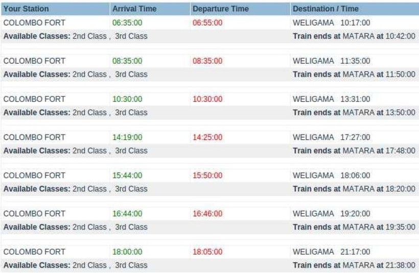 Вот здесь вы можете самостоятельно посмотреть расписание, только введите название станции отправки (Colombo Fort) и станцию прибытия (Weligama) и расписание будет видно.