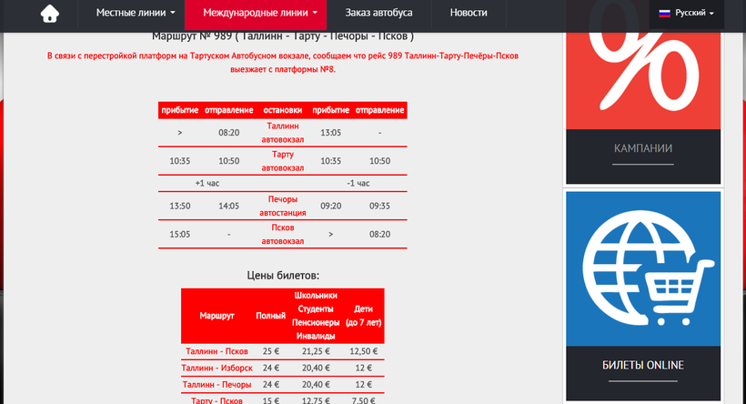 Проезд от Тарту до Пскова стоить 15 евро. Но если вы, скажем, школьник, студент или пенсионер, то цена может быть ниже. Разницы между ценами на сайте и в кассе автовокзала нет никакой.