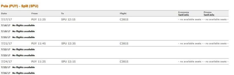 В данный момент рейсы отправляются по понедельникам и пятницам. В понедельник самолет покидает аэропорт Пулы в 11:25 и прибывает в Сплит в 12:15. В пятницу вылет происходит чуть позже, в 11:45. Прибытие в Сплит в 12:35.