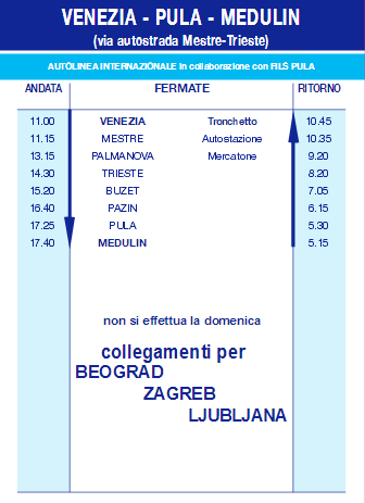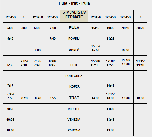 - Brusutti. Через Триест и Пулу проезжает автобус, следующий из Венеции в Медулин. В Триесте он останавливается в 11.00, прибывая в Пулу в 17.25;