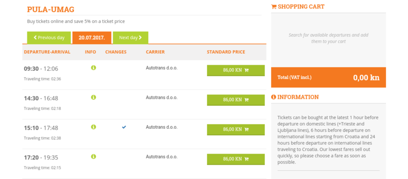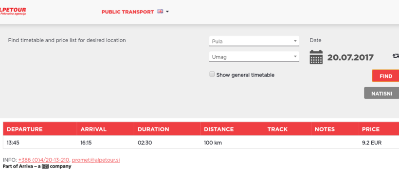 Наверно, я в первый раз в жизни пожалела, что не взяла машину на прокат. Во-первых, мы прилично потратились на билеты, во-вторых, поездка заняла уйму времени. На машине бы доехали за 1,5 часа, а то и меньше. Кстати, самый короткий маршрут идет по платному автобану А9, проезд в Умаг из Пулы обойдется в 6 евро. Для этого на въезде возьмите чек и сохраните до Умага. На выезде с трассы заплатите за проезд.