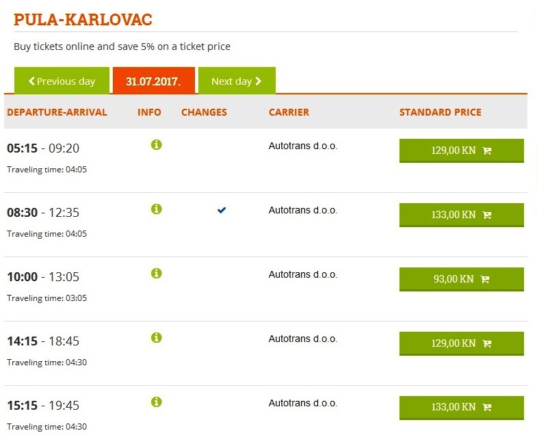 Расписание автобусов Brioni Pula меняется в зависимости от дня недели. С понедельника по пятницу автобусы до Карловаца отходят от вокзала в 5:15, 8:30 и 10:00 утром. Есть еще два дневных рейса в 14:15 и 15:15. В субботу всего два рейса – утром в 5:15 и днем в 14:15. В воскресенье автобусы отправляются в 5:15 и 10:00 утра, днем в 14:15 и 15:15, а так же вечером в 17:00.