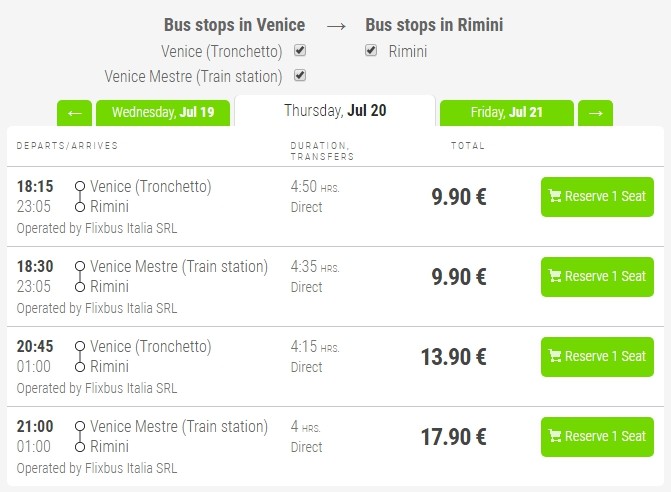 Из Венеции в Римини от Flixbus курсирует два автобуса, что стартуют сначала с Tronchetto, а затем заезжают для посадки пассажиров в Местре.