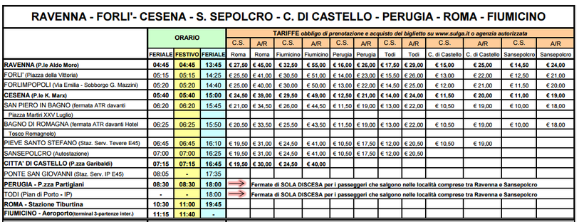 Для пассажиров доступны два прямых автобуса, что отправляются из Равенны с автобусной остановки на Piazzale Aldo Moro в 04.45, 13.45.