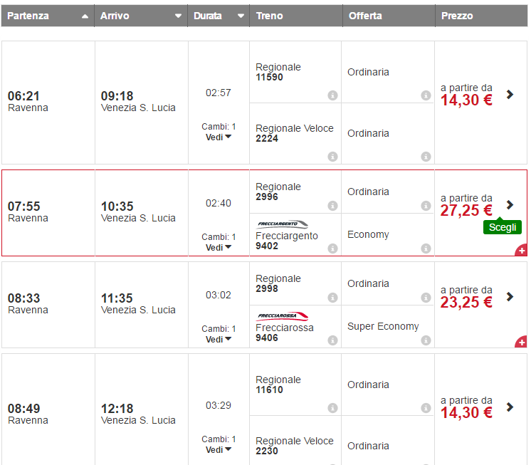 - расписание. Преимущество передвижения по железным дорогам состоит в том, что график движения поездов составлен очень точно. Даже если вам придется делать пересадку (как, например, на маршруте Равенна-Венеция), то ждать следующий состав придется минут 10-15, максимум полчаса.