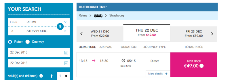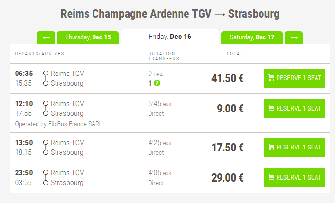 Первый вариант, о котором я хочу рассказать, это автобусные перевозки. Маршрут между Реймсом и Страсбургом обслуживаются компаниями - Eurolines, Flixbus, Ouibus. Путешествие на таком транспорте длится от четырех с половиной часов и более в зависимости от перевозчика и маршрута поездки (прямым автобусом или с пересадкой в Париже).