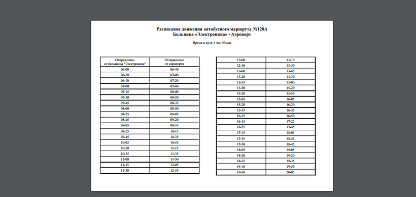 Автобус №120А отправляется от аэропорта ежедневно, только вот в пути он будет 1 час 30 минут (это касается и остальных маршрутов), вроде бы и ехать не так далеко, но за счет того, что будет много остановок, время увеличивается. Первый автобус от аэропорта отправляется в 06:40, а вот последний отправляется в 20:05. Ниже я приложу скриншот, чтобы вы видели с каким интервалом автобус ходит. Этот автобус едет до железнодорожного вокзала, пожалуй, этим автобусом вам и надо будет воспользоваться, чтобы сразу доехать до вокзала, так как дальнейший маршрут будет на электричке до Дивногорья.