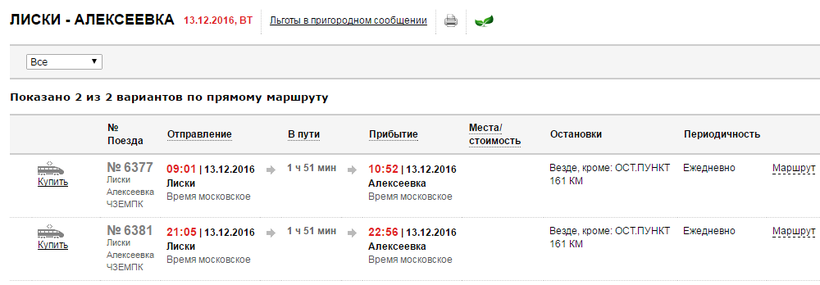 Первая электричка Лиски – Алексеевка ходит совсем редко, всего лишь дважды в день и на скриншоте это прекрасно видно. Первая отправляется утром в 09:01, а последняя вечером в 21:05.