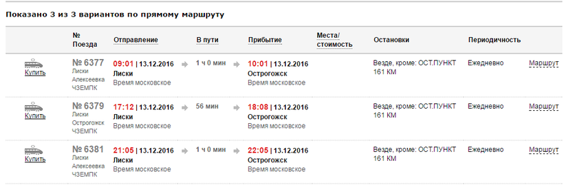 Вторая электричка Лиски – Острогожск идет так же по нужному вам направлению, только, как и первая электричка, она отправляется редко – трижды в день, но зато ежедневно в: