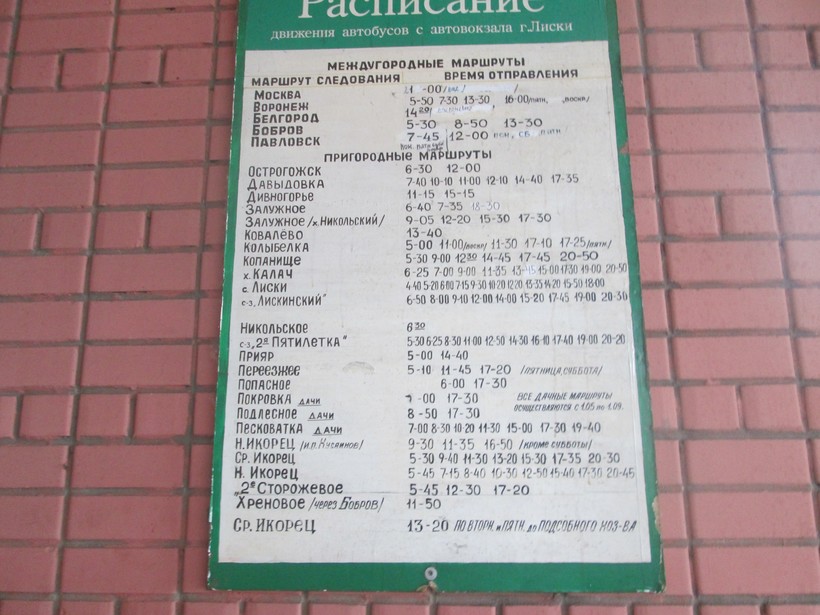 Этот способ чуть легче, хотя с какой стороны смотреть. Я уже рассказала, как из Воронежа доехать на электричке до Лисков. Так вот сойти надо будет в Лисках и забыть об электричках, дальше маршрут будет на автобусе, тем более что автовокзал находится рядом с железнодорожным вокзалом. Вам надо будет потратить 10-15 минут, чтобы пешком дойти до автовокзала или спросить у кого-то из прохожих, как дойти, но я вам на карте отметила, где находятся вокзалы, мне кажется, найти будет легко. Сразу хочу сказать, что в интернете можно найти информацию о расписании, но дважды в год расписание меняется (летом и зимой).