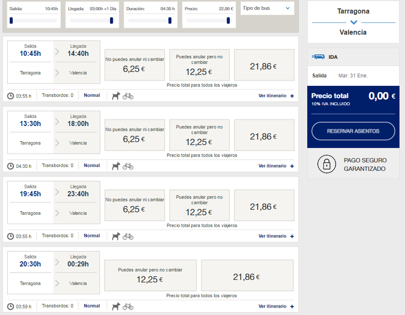 Проездной на автобус до Таррагоны обойдется около 2.5 евро, в Валенсию - от 6 до 22 евро.