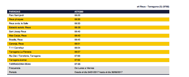 - Из Реуса в Таррагону можно доехать на автобусах от такой компании как Monbus, а поездка в таком случае займет всего лишь полчаса. Первый автобус отходит уже в шесть утра, а последний отправляется около десяти вечера. Расписание лучше просматривать на сайте перевозчика, чтобы быть уверенным в доступности того или иного автобуса. Этот транспорт в Реусе и Таррагоне останавливается на посадку и высадку пассажиров на многих остановках, даю вам скрин с официального веб портала перевозчика. Прибытие на автовокзал Таррагоны (Calle Pere Martell, 1).