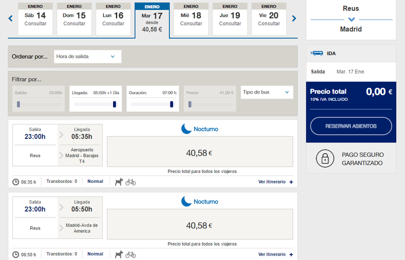 Между городами курсирует также и один ночной автобус, который отправляется с автостанции Реуса в 23.00 и прибывает в Мадрид через практически семь часов. Это достаточно удобно, ведь выехав вечером, уже утром можно быть на месте и провести весь день в Мадриде.Также хочу отметить, что в испанской столице автобус останавливается в двух местах:около мадридского аэропорта, в частности, именно у четвертого терминала (это очень удобно, ведь часто туристы прилетают в Испанию на отдых в Реус именно в столичный аэропорт);на автобусной остановке, расположенной на Avda de America.
