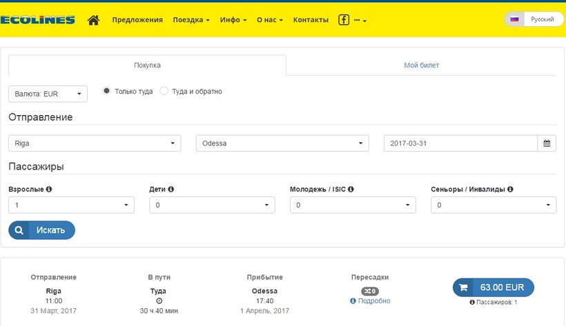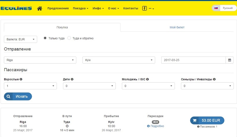 Теперь о расписании рейсов из Риги в Одессу. Я покупала два билета на прямой рейс транспортной компании Ecolines.
