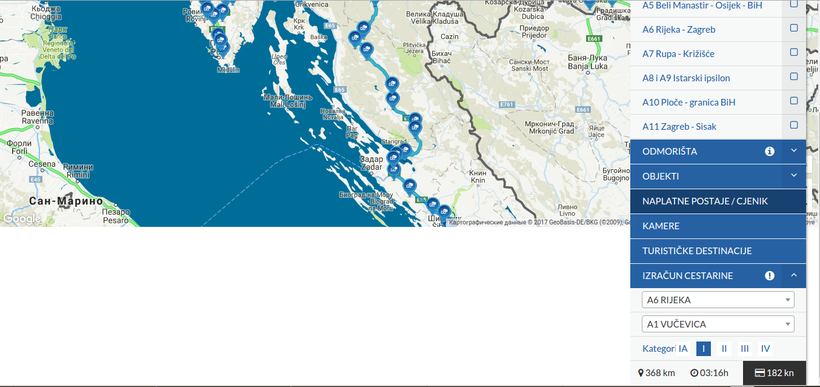 Проезд по всем крупным автомагистралям в Хорватии платный. Я оставлю тут скриншот с хорватского сайта, на котором можно рассчитать стоимость дорожного сбора: