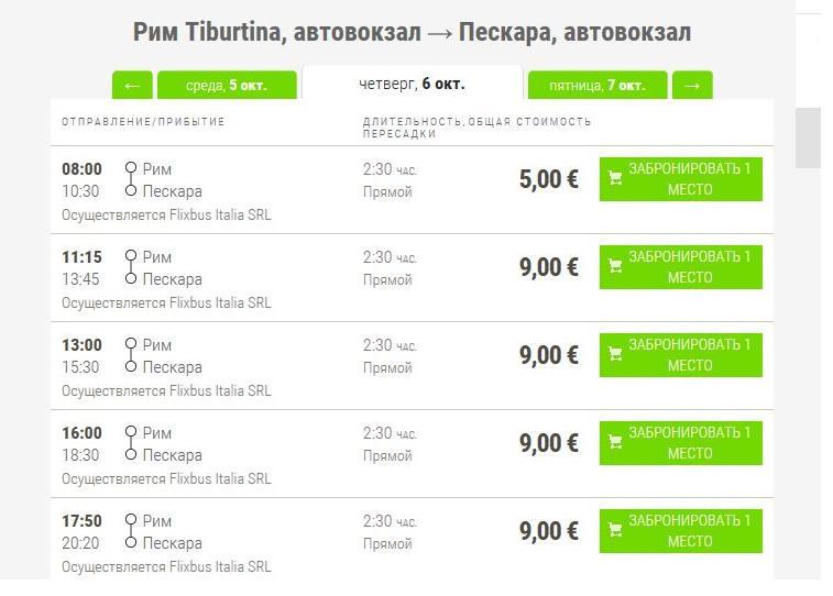 По этому направлению работает несколько автобусных перевозчиков: Flixbus, Arpa, Di Febo Capuani, Dicarlobus и Prontobus. Я не буду расписывать все, можно зайти по ссылкам и посмотреть актуальное расписание на ваши даты. Расскажу лишь про Flixbus, который выбрали мы. Ежедневно с автовокзала Tiburtina в Риме отправляется 5 прямых рейсов до автовокзала Пескары, который расположен всего в 300 метрах от железнодорожного вокзала. Есть отправления в 08:00, 11:15, 13:00, 16:00 и 17:50. По воскресеньям утренний рейс не в 08:00, а в 09:00. По времени дорога занимает всего 2,5 часа. А если учесть, что в автобусе есть туалет, розетки и беспроводной интернет, то это время пролетает незаметно.