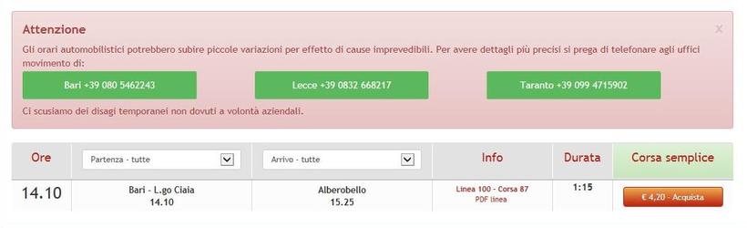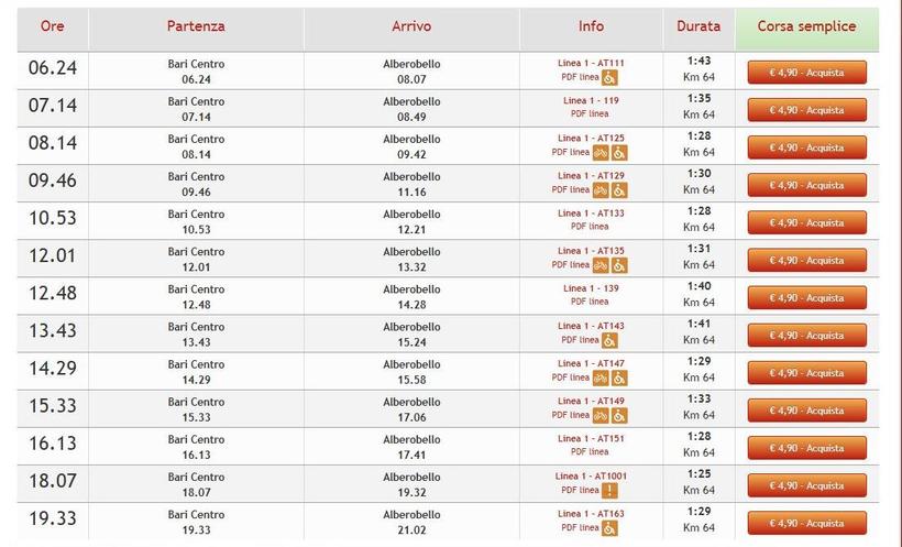 В день между этими городами есть всего лишь один рейс: в 14:10. Автобус отправляется с автостанции Бари на Largo Ignazio Ciaia и через 1 час 15 мин высаживает пассажиров возле Piazzale Fratelli Kennedy в Альберобелло. Покупать билеты можно как в кассах, так и онлайн (не раньше, чем за неделю до поездки), стоимость проезда в одну сторону - 4,20 евро.