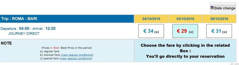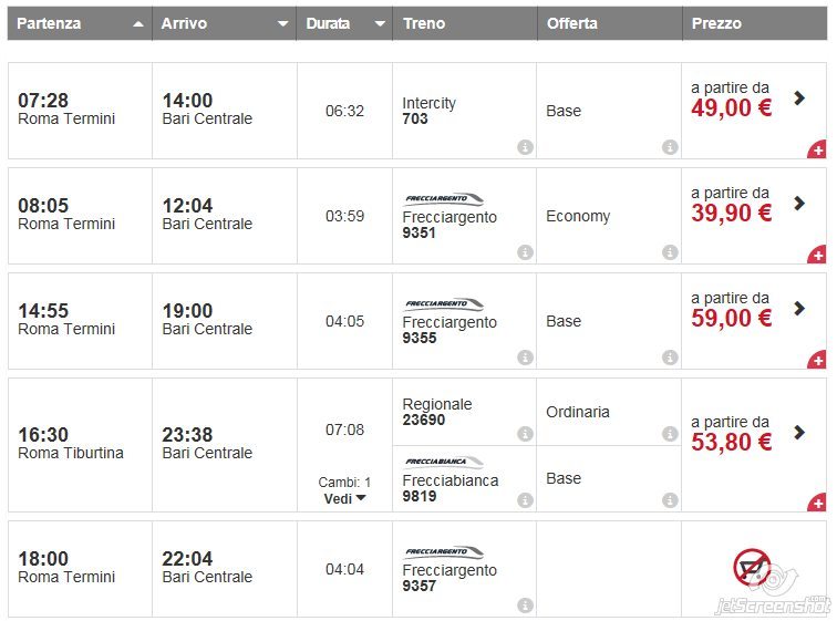 Ситуация та же, что и с автобусом - нужно доехать сначала до Бари. Ежедневно, не зависимо от дня недели, есть 5 рейсов с 07:28 до 18:00, интервал между ними разный - от 35 мин до 7 ч, ниже все видно на скрине с сайта trenitalia.it. Поезда отправляются со станций Roma Termini (на Piazza dei Cinquecento, 1) и Roma Tiburtina (на Circonvallazione Tiburtina) и едут до Bari Centrale (на Via Giuseppe Suppa, 48). Время в пути составляет от 4 до 7 часов, в зависимости от рейса. На этом маршруте ездят поезда Intercity, Frecciargento, Frecciabianca и Regionale. Не стоит сравнивать итальянские региональные поезда с нашими электричками, здесь все намного цивилизованней. Вот интересная статья про железные дороги в Италии.