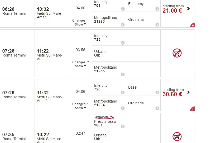 Напрямую в Амальфи поезда не ходят, поэтому нужно сделать 1-3 пересадки. Удобнее всего выбрать вариант с пересадкой в Салерно. Общее время в пути 2 часа 40 минут. Ходят часто, каждые 40-60 минут. Первый поезд отправляется в 6.26, последний – в 18.50.