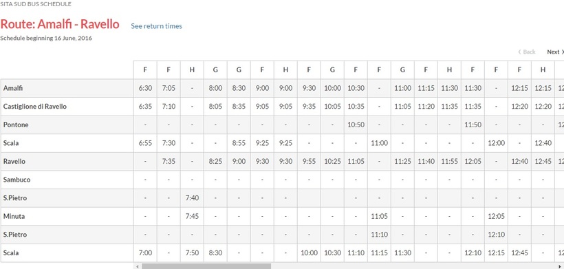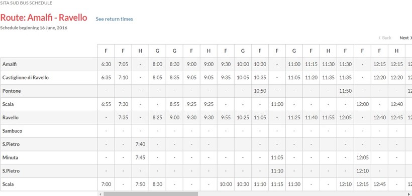 На этой же станции нужно сесть на автобус компании Sita, который идет по маршруту Amalfi-Ravello-Skala. Ехать не очень долго, примерно 40 минут. Автобусы ходят каждые полчаса.