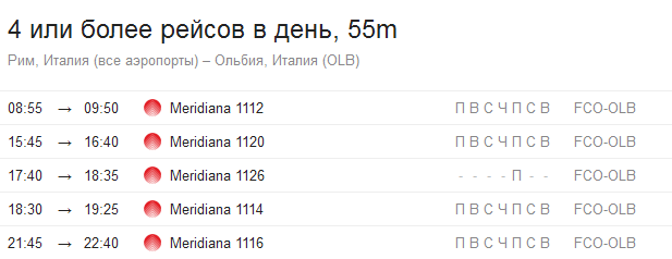 Между главным аэропортом Рима Фьюмичино и Олбией ежедневно совершается несколько рейсов. Самолеты вылетают в стороны острова в 08.55, 15.45, 18.30, 21.45. В пути нужно провести чуть меньше часа.