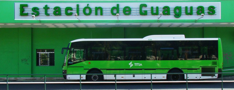 Прямо у выхода из аэропорта по правую сторону находится остановка общественного автобуса. Местные жители называют автобусы «гуагуа». Все общественные автобусы Канарских островов окрашены в ярко зеленый цвет и на их боковой части находится надпись Titsa – эмблема компании, управляющей общественным транспортом Тенерифе. Из аэропорта Южный в Коста Адехе можно доехать за полчаса на автобусе: