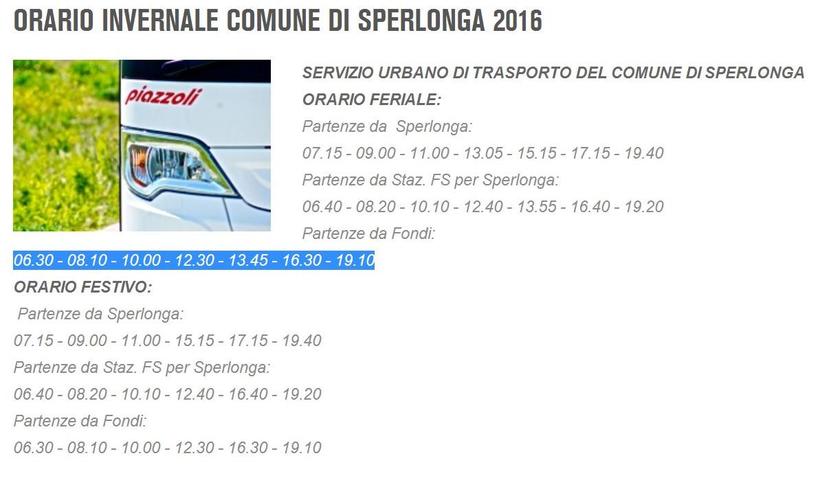 Железнодорожный вокзал в Сперлонге находится на расстоянии 12 км от центра города. Местные автобусы отправляются от железнодорожного вокзала Fondi-Sperlonga летом примерно раз в час, в зимнее время чуть реже. Ниже приведено зимнее расписание (строчка выделена синим цветом). До центра Сперлонги автобус идет менее получаса. Билет обойдется вам в 1 евро.
