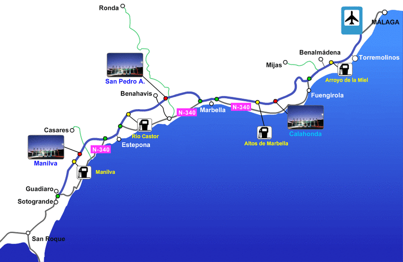 Вы должны знать, что в Испании невероятно высокие штрафы. И как показывает статистика, самые частые нарушения туристов, это парковка в неположенном месте и нарушения знаков ПДД. Если у нас многие водители могут ездить не пристегнутыми, то в Испании за это будет штраф, причем не маленький. По европейским меркам аренда автомобилей в Испании относительно невысокая, но если вы не будете соблюдать ПДД, тогда заплатите больше за штрафы, чем за саму аренду автомобиля. Поскольку вы будете ехать из аэропорта Малаги, вы будете проезжать по автомагистрали А-7. И что самое главное, проезд по этой дороге платный. На трассе будет несколько пунктов оплаты проезда, но так же можно поехать в объезд.