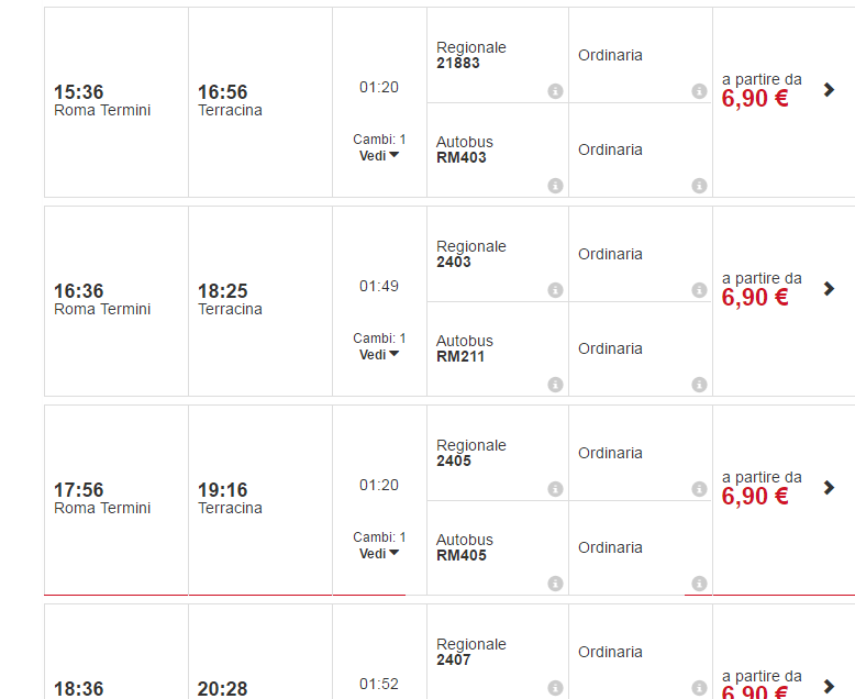 Но сейчас в таком маршруте есть неудобство, так как станция Террачины закрыта на капитальный ремонт из-за случившегося несколько лет назад оползня. По этой причине, если вы купили билет до Террачины, то вас довезут только до станции Priverno, а потом пересадят на автобус, принадлежащий компании-перевозчику. Мне кажется, что удобнее будет сразу садиться на автобус, который следует до Террачины.