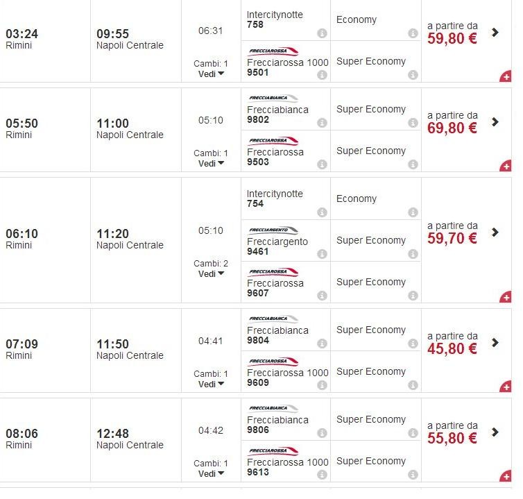 Начиная с 03:24 и заканчивая 19:17 каждые 20 мин-2,5 часа поезда едут с вокзала в Римини (на Piazzale Cesare Battisti) в Неаполь (на Piazza Giuseppe Garibaldi). Правда, прямых рейсов нет, большинство из них с одной пересадкой в Болонье. Весь путь занимает от 4,5 до 6,5 часов. Хочу отметить, что зимой расписание немного меняется, к примеру, нет ночного поезда. А вообще, надежней всего смотреть свои даты на сайте trenitalia.it.