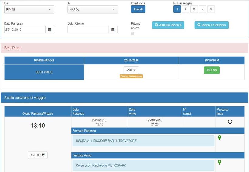 Компания Eurolines ежедневно совершает один прямой рейс между этими городами. Отправление в 13:10 от остановки на Viale V. Emanuele II, 15 в Римини, а прибытие в 21:20 на автовокзал (на Corso Arnaldo Lucci), расположенный в нескольких шагах от железнодорожного вокзала Napoli Centrale.