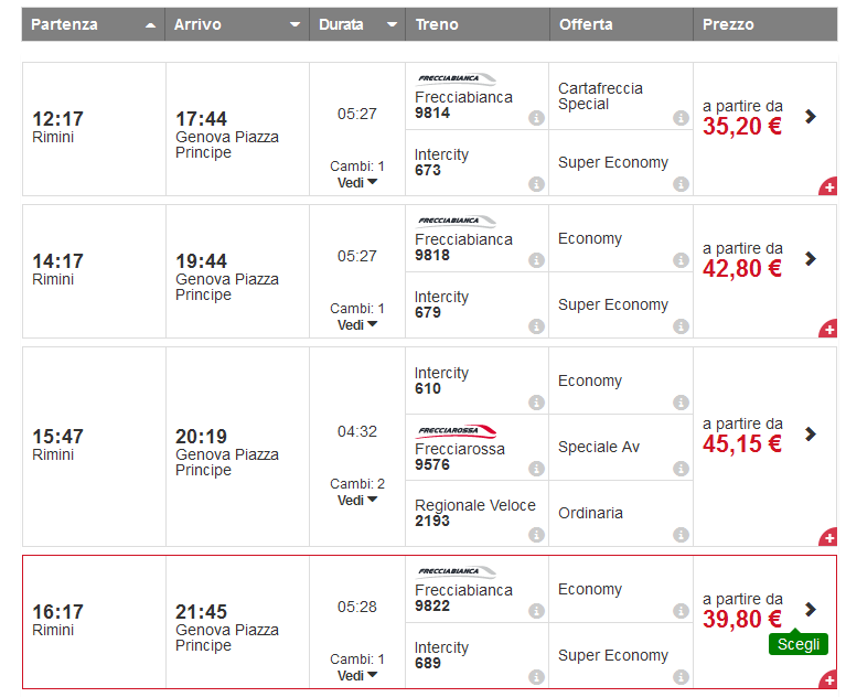 К сожалению, добраться из Римини в Геную на поезде без пересадки нереально. Все маршруты предполагают минимум одну пересадку, как правило, в Милане.