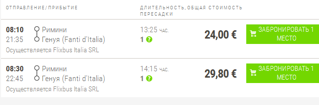 Из Римини вы выедите в 08:10 (если ехать через Венецию) или в 08:30 (если добираться через Рим). В Геную автобусы тоже прибывают практически одновременно: в 21:35 и 21:45 соответственно. К сожалению, и в первом, и во втором случае придется посидеть на автовокзале в ожидании своего автобуса.