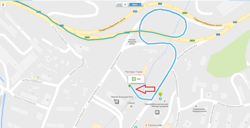Выходить нужно на остановке «ЖД Вокзал». Там же сразу переходить дорогу и пересаживаться на троллейбус, следующий до Ялты. Они курсируют каждые 20 минут до позднего вечера.