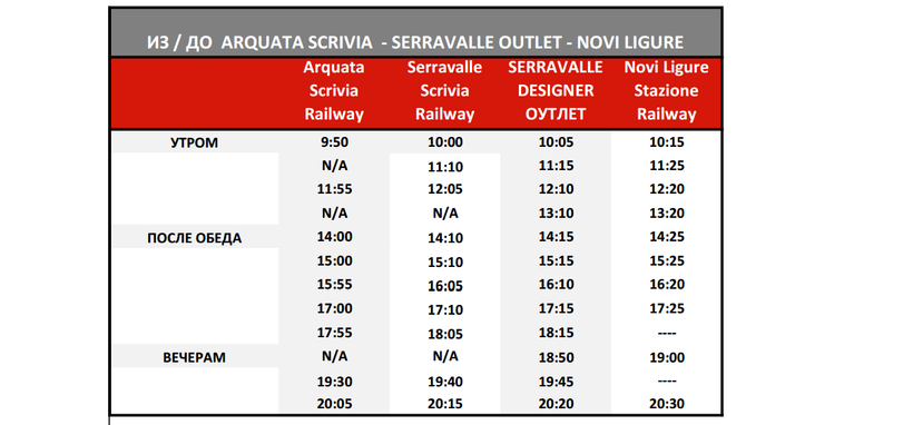 Если вы хотите посетить аутлет, то лучше всего предпочесть поезд, который отправляется с железнодорожного вокзала Римини в 06:10. В данном случае нужно будет сделать только одну пересадку в Алессандрии, а на станцию Serravalle Scrivia вы прибудете в 11:50. В таком случае вам нужно поскорее выйти с вагона, так как в 12:05 отправляется автобус-шаттл, который отвезет вас к входу в аутлет. Если же вы не успеете на автобус, то придется почти час ждать следующий рейс.