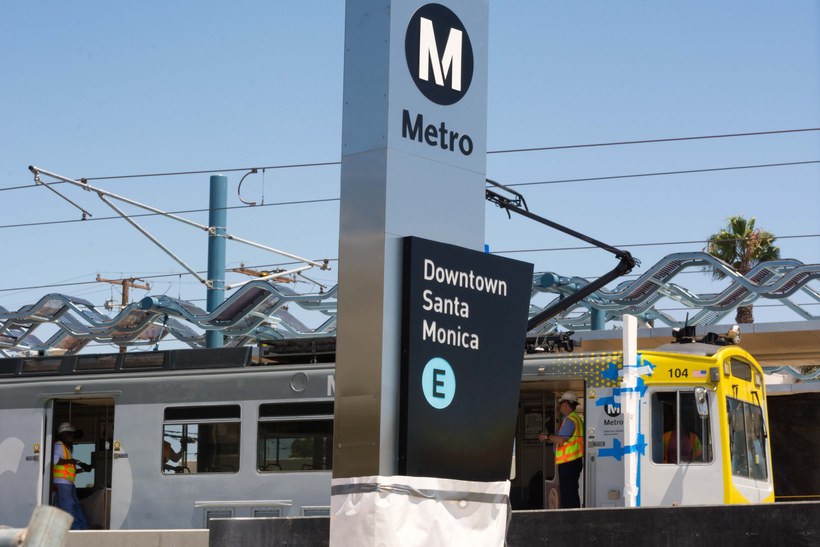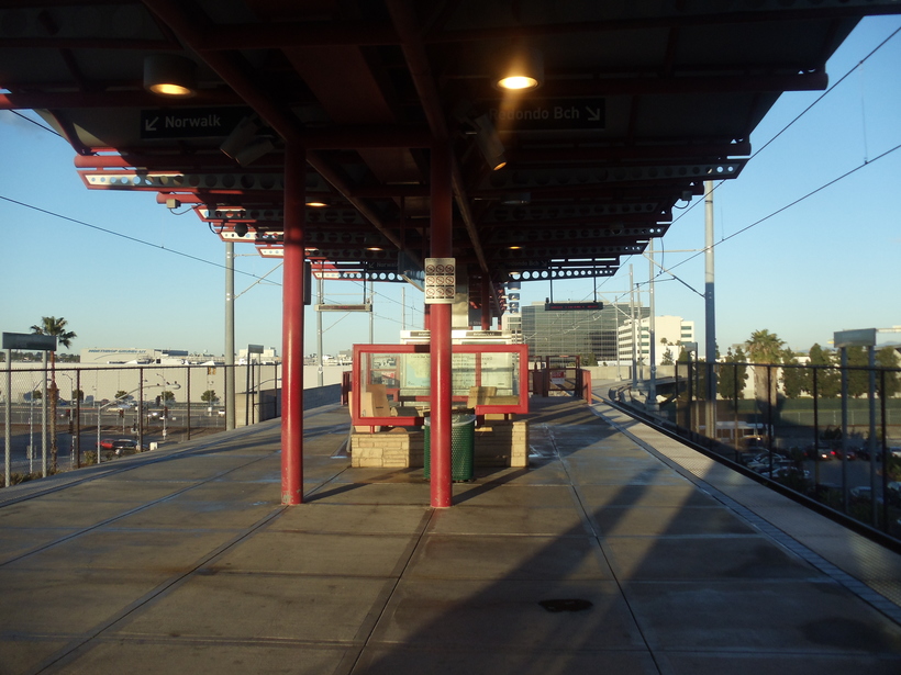 Вон она, Aviation, слева на зелененькой ветке, рядом с аббревиатурой LAX. А теперь найдите станцию DownTown Santa Monica, левее всех на голубой ветке. Вам нужно до неё доехать. Aviation/LAX station, куда вы приедете.