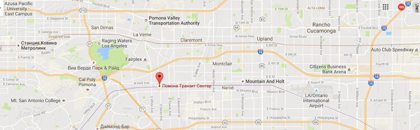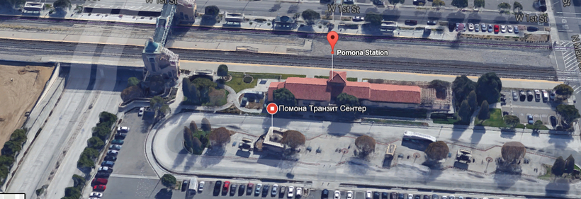 От Pomona Transit нужно доехать до Union Station в Лос-Анджелесе. Добраться можно на электричке, которая ходит каждые 3 часа и доезжает за час. Электричка называется Riverside Line. На карте Вы видите Помона Транзит Центр и рядом станция поездов